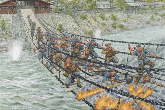 飞夺泸定桥,是中国工农红军长征中的一场重要战役,发生于1935年5月29日。中央红军部队在四川省中西部强渡大渡河成功,沿大渡河东岸北上,主力由安顺场沿大渡河西岸北上,红四团战士在天下大雨的情况下,在崎岖陡峭的山路上跑步前进,一昼夜奔袭竟达240里,终于在5月29日凌晨6时按时到达泸定桥西岸。第2连连长和22名突击队员沿着枪林弹雨和火墙密布的铁索踩着铁链夺下桥头,并与东岸部队合围占领了泸定桥。