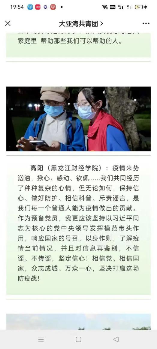 本轮疫情呈现多点散发态势,深圳等地区都出现了新冠肺炎,金融学院20级金融工程一班学生预备党员高阳在寒假期间主动去做疫情志愿者,在防疫战线上,不畏艰险,知难而上,勇担重任,或战斗在与病毒厮杀的一线,或为防疫宣传奔走,或为保障公共秩序勇于奉献。始终坚持以习近平新时代中国特色社会主义思想为指导,充分发挥党员的先锋模范作用,响应国家的号召,以身作则,了解疫情当前情况,积极协助当地政府开展疫情防控工作,用实际行动证明志愿者的初心和使命。不信谣、不传谣,坚定信心!相信党、相信国家,众志成城、万众一心,坚决打赢这场防疫战。