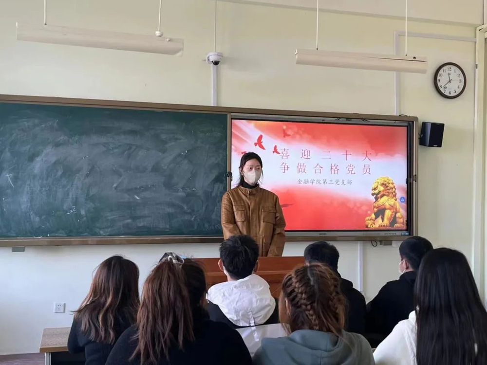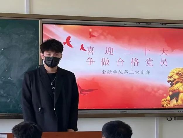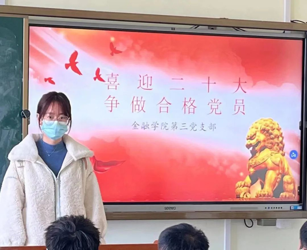 浩荡春风起,奋进正当时。10月10日,为迎接党的二十大胜利召开,金融学院在尚学楼429教室召开“喜迎二十大,说句心里话”主题活动。金融学院学生第三党支部书记闫佳铭老师出席本次会议,其中孟德轩,白雪婷,李佳鑫三名同学作为代表以真挚淳朴的话语向党报告对祖国的热爱与工作上的积极进取。