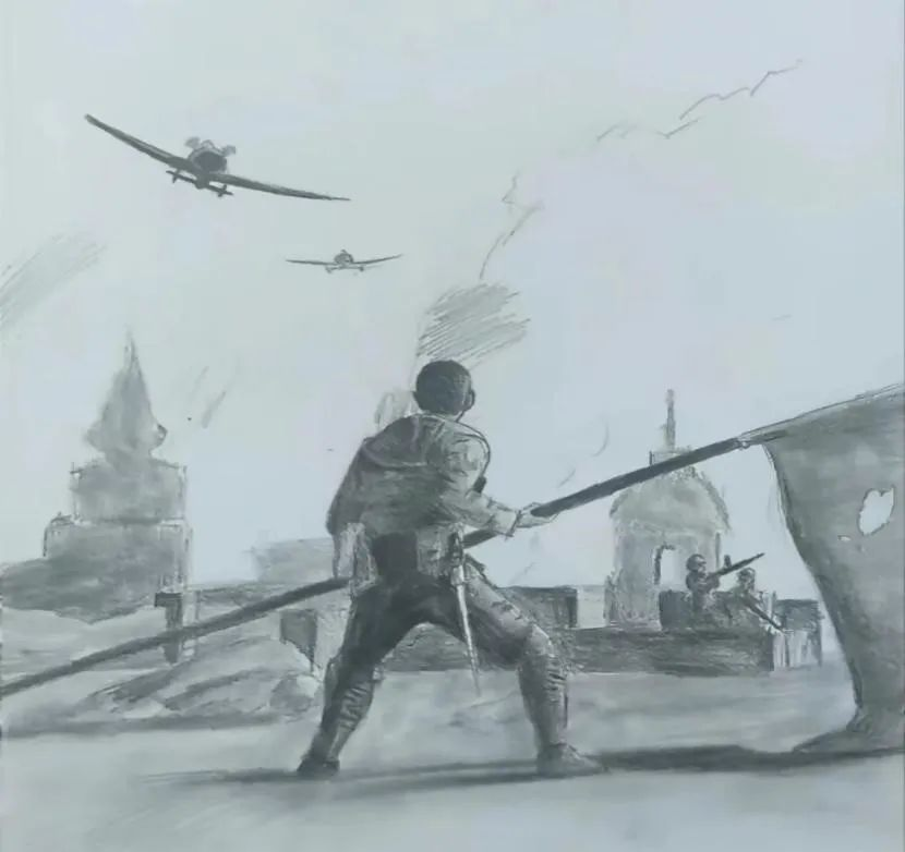 作品介绍:在面对日本精良的武器装备下我们中国军人即使使用落后的武器,也丝毫不畏惧,仍然目光坚毅,威风凛凛,用此作品来表达出对英雄的敬佩,我们的战士们装备落后用红缨枪和大刀却依然上阵杀敌并且赢下了这场战斗,用鲜血保护我们的国家,向英雄致敬。