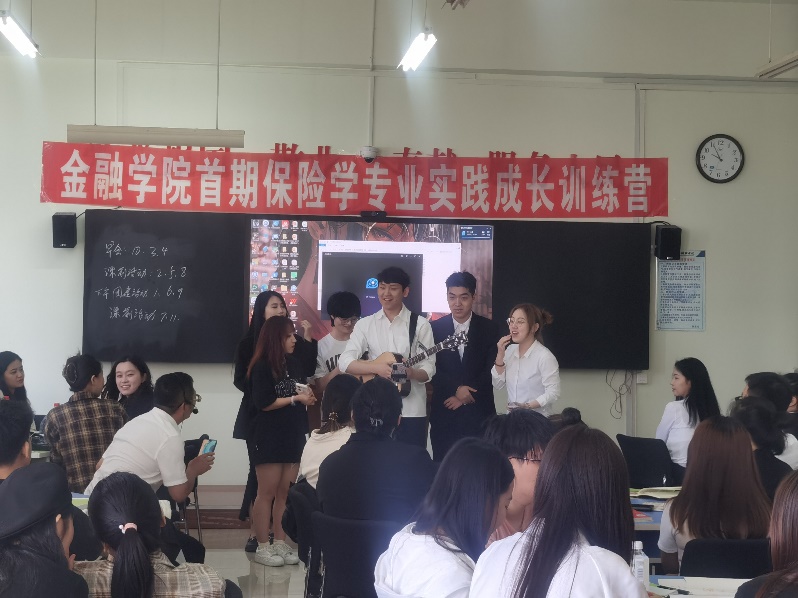 团队建设部分,学生分成11个小组进行课前活动,分别模拟寿险行业早会、团队破冰、团队活动等环节。各小组积极排练、各展所长,最后角逐出优秀团队。团建活动让学生领悟团队协作精神,凝聚团队力量,感受寿险实践的魅力。