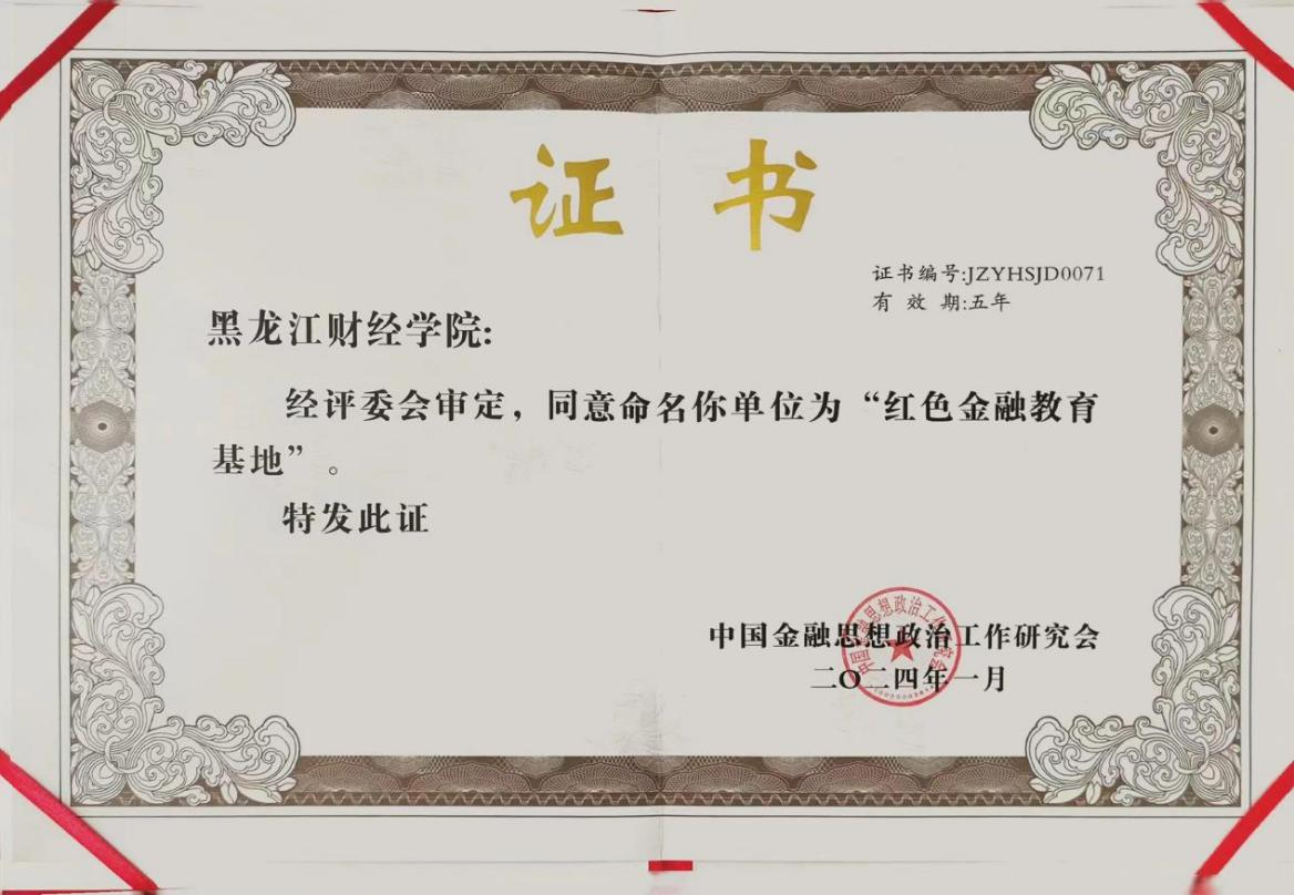 近日,黑龙江财经学院被中国金融思想政治工作研究会正式命名“红色金融教育基地”并授牌、颁发证书。