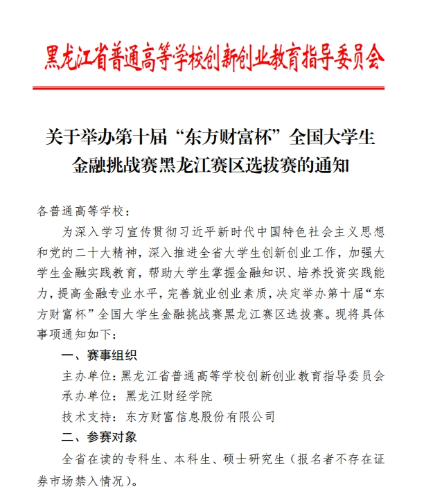 本次竞赛省赛阶段由黑龙江省普通高等学校创新创业教育指导委员会主办,黑龙江财经学院承办,东方财富信息股份有限公司提供技术支持。面向全省在读的专科生、本科生、硕士研究生(报名者不存在证券市场禁入情况)。