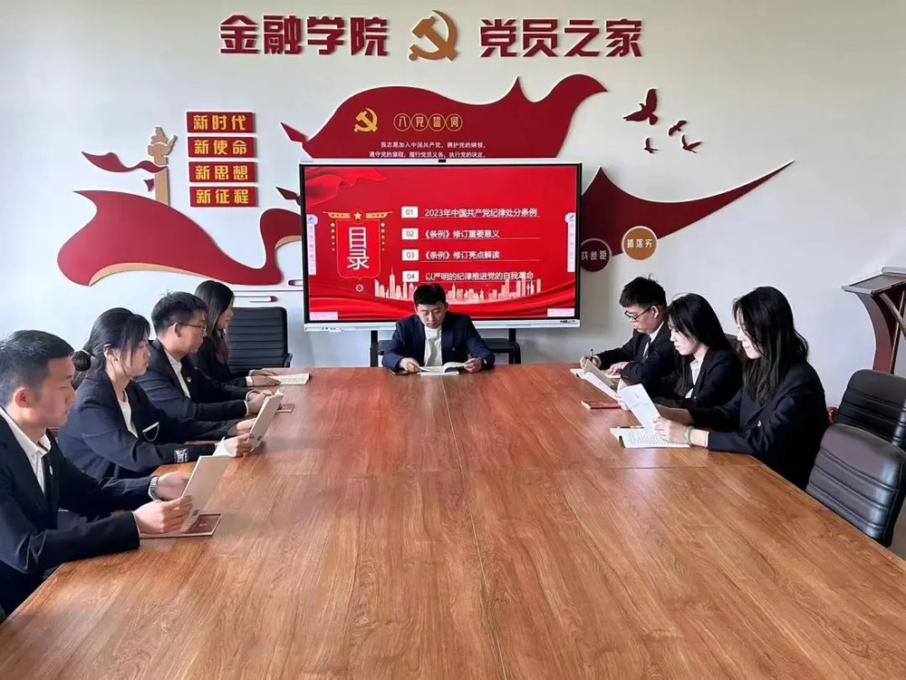 为深入学习习近平总书记关于党纪学习教育的重要讲话和重要指示精神,加深学生党员对党纪的认识和理解,强化学院的学风建设,提升党员学生的思想政治素质。5月16日,金融学院各学生党支部书记分别以“严明党的纪律,加强党性修养”、“坚守初心使命,筑牢党纪防线”、“学习解读中国共产党纪律处分条例”、“学党纪,守条例,弘扬廉洁文化”为主题为各支部学生党员讲授党纪学习教育专题党课。
