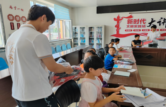 (实践团队为孩子们送上学习用品)