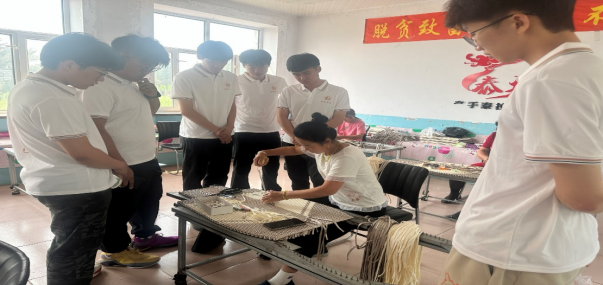 随后,实践团队走访了当地村镇企业,向当地养殖场负责人关于当前发展情况、销售情况与未来经营理念进行了解。养殖场负责人指出“乡村振兴,产业是关键。要整合优势资源,发展“一村一品,一乡一业”和特色产业,大力推进农业产业化,同时发挥家庭农场、农民合作社、农业企业的带动作用,让农民更多分享产业增值收益”。实践团队员们和负责人对未来养殖场发展面临的问题也进行了深度交流。 在扶贫车间中,实践队员更是亲身体验车垫制作过程,并与车间员工交谈,感受新农村经济产业发展。