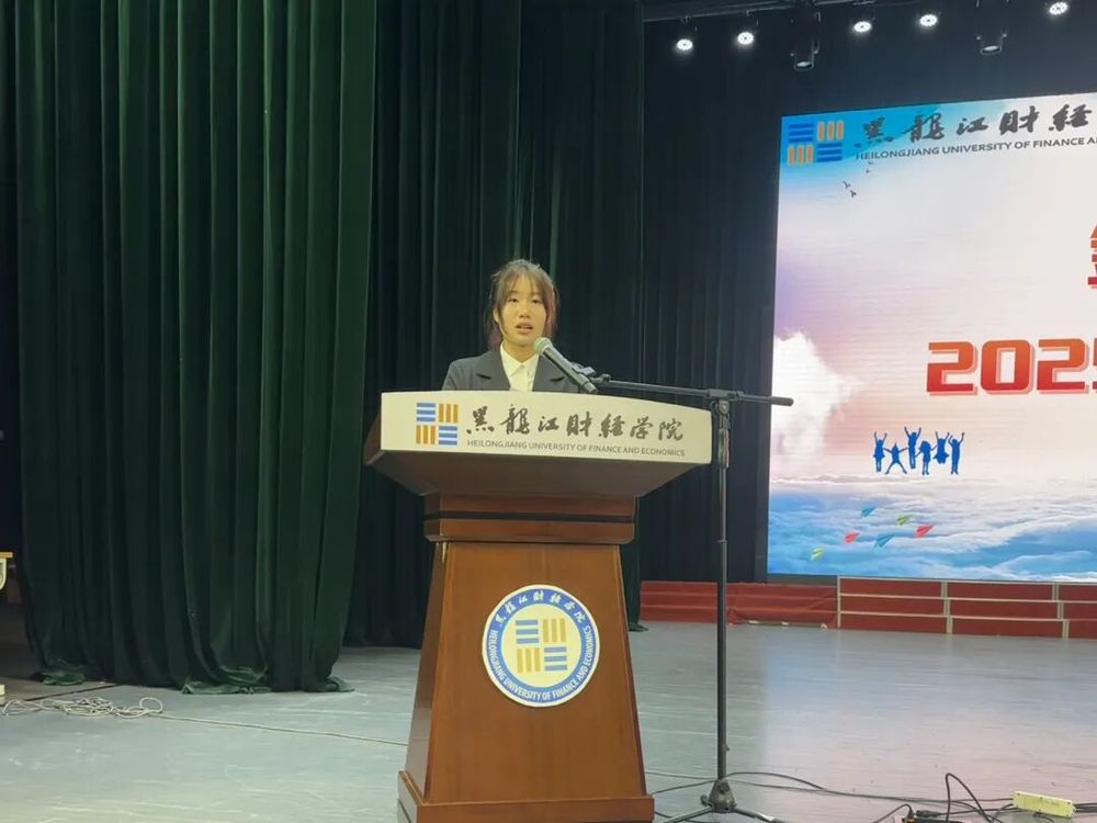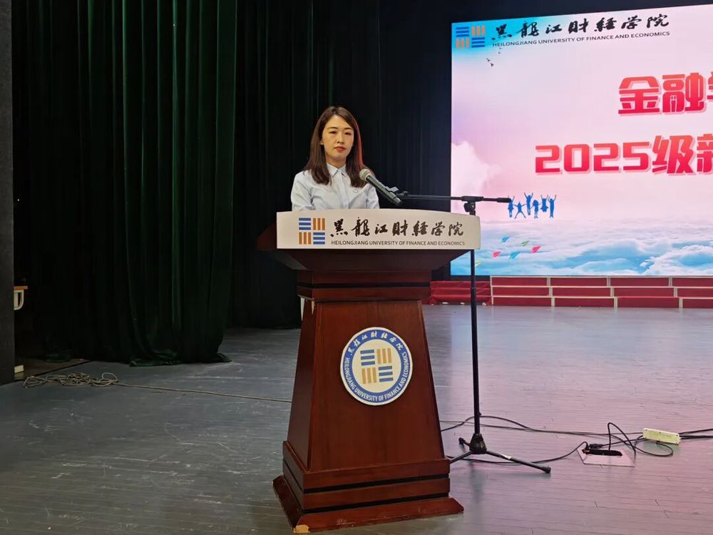 2025级金融工程一班王月代表新生发言。她字里行间满是迈入大学的激动与对未来的美好憧憬。她承诺将倍加珍惜来之不易的学习机会、积极参与各类实践活动,并号召全体新生携手共进,共同成长为有理想、有担当的高素质金融人才。同时代表新生表达了学校和老师为迎接他们的到来做得精心准备,表示能来到黑龙江财经学院,成为龙财人感到无比自豪。