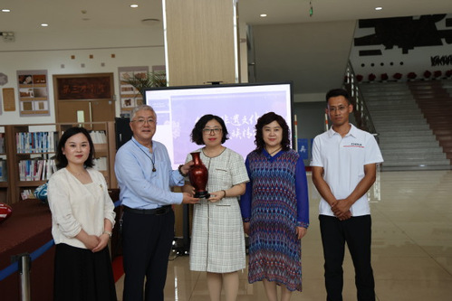 夏立军、白艳萍向图书馆捐赠脱胎漆器作品《赤宝砂梅瓶》。在交流互动环节,夏立军深入讲解了金漆镶嵌工艺的历史渊源与精湛技艺,并对现场师生提问进行详细解答。