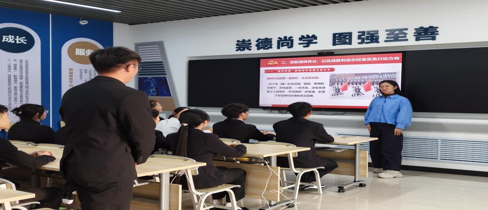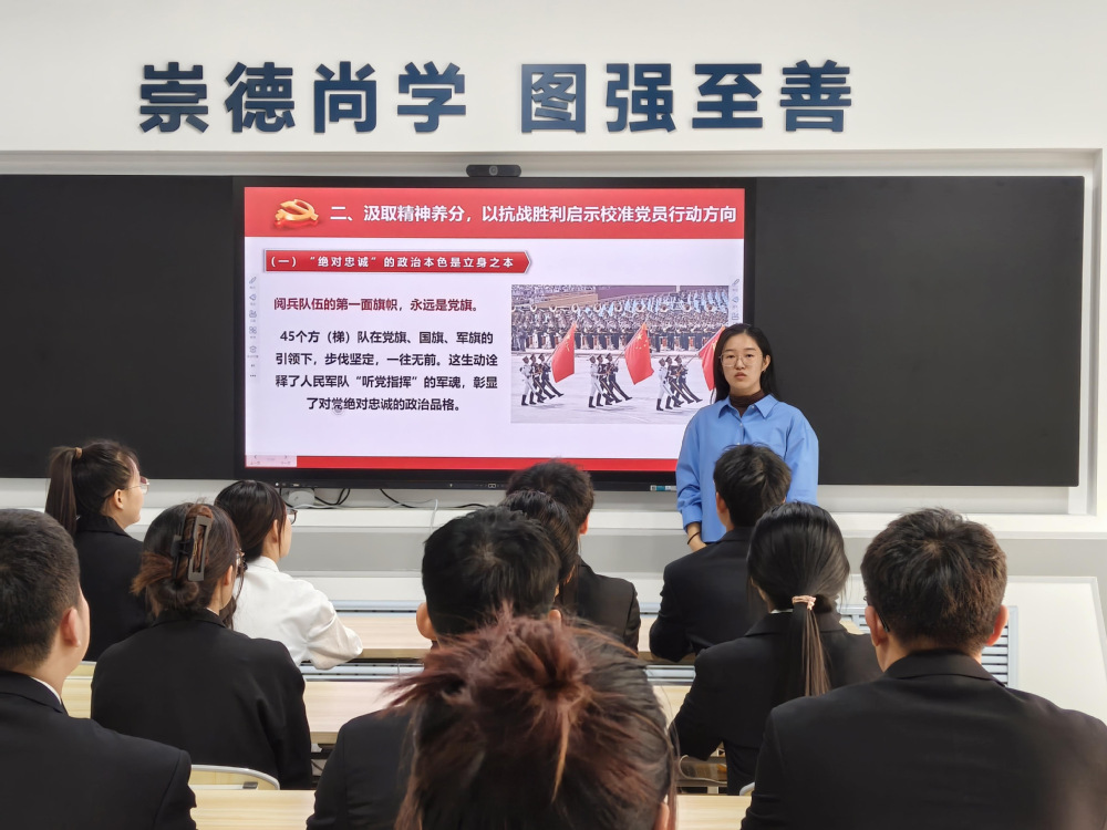 党支部书记杜潇赫带领支部全体党员逐字逐句学习了习近平总书记在纪念大会上的重要讲话。她强调,讲话系统总结了抗日战争胜利的伟大历史意义和深远现实启示,精辟阐述了伟大抗战精神的丰富内涵,并对在新征程上继承和弘扬这一精神提出了明确要求。她要求全体党员不仅要学深悟透,更要紧密联系自身思想、学习和工作实际进行思考。围绕“如何将讲话精神转化为服务同学的实效”这一主题,与会党员展开了热烈讨论。宣传委员刘鹏同志表示:“总书记的讲话是激励我们奋勇前进的号角。作为一名学生党员,我们要把学习成果体现在为同学解决实际困难的具体行动中,让服务更有温度、更有力度。”